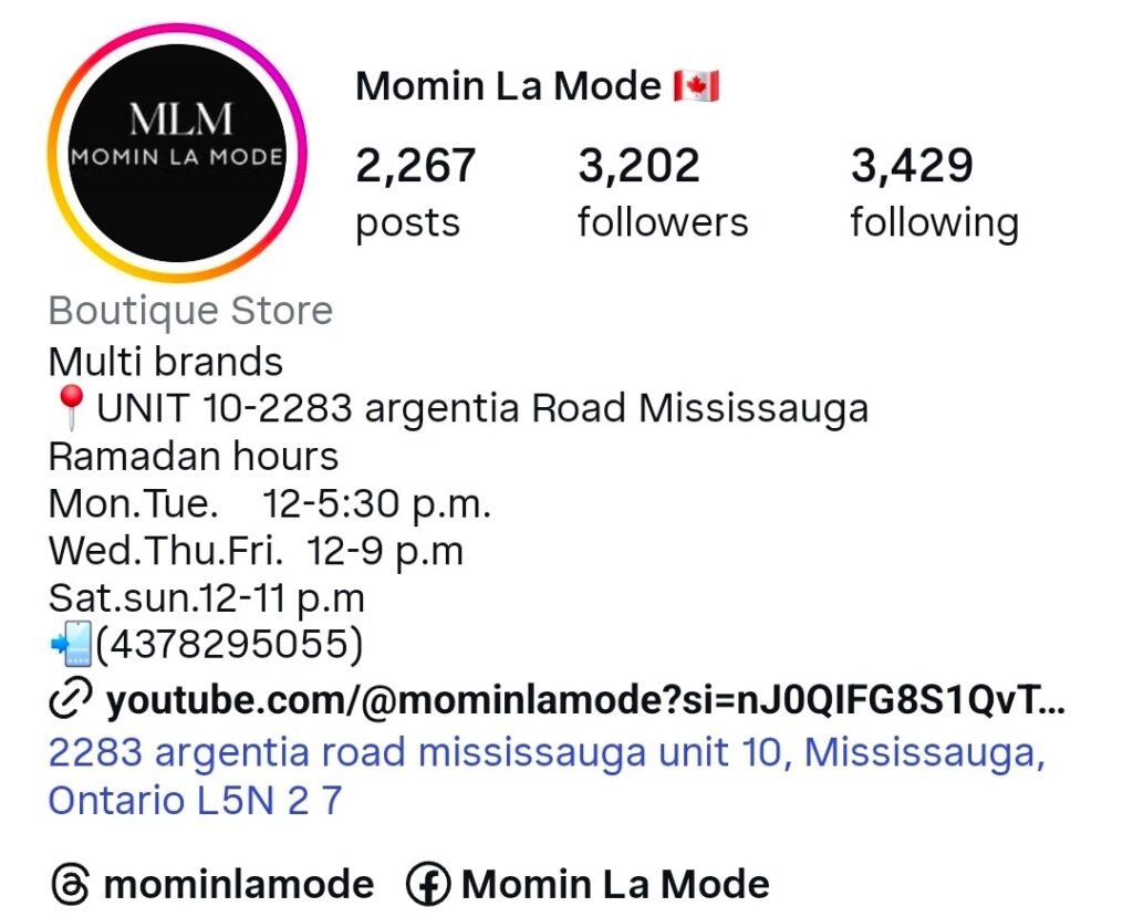 Momin La Mode specialises in curated designer fashion from Pakistani and Indian labels. Their boutique carries bridal outfits, formal ensembles, and hand-embroidered designs by designers such as Marina Yacin.