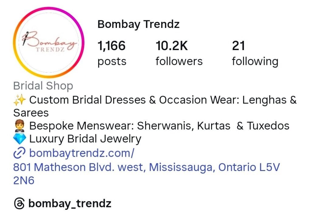 Bombay Trendz is a well-known boutique that focuses on made-to-measure Indian bridal wear. The store offers bridal lehengas, sarees, and men’s wedding outfits including sherwanis and kurta sets.