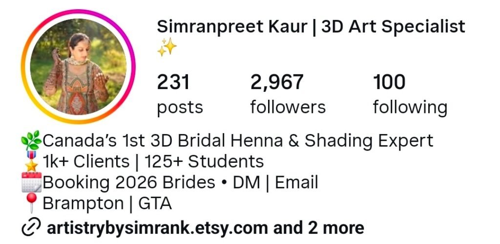 Simran’s Henna and Nail Artistry is a Brampton-based studio known for innovative bridal mehndi designs and detailed artistry.