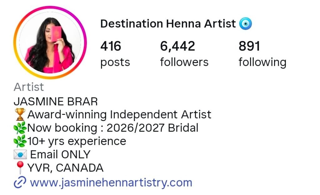 She is recognized for blending traditional Rajasthani and Arabic henna patterns with modern bridal aesthetics.