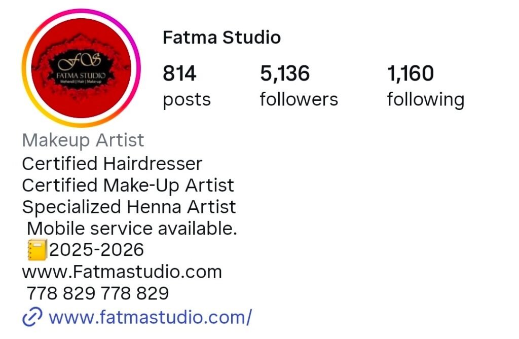 Fatma Studio offers bridal mehndi alongside full salon services such as hair and makeup. Located in a central Surrey studio, it provides a convenient option for brides who want multiple beauty services in one place.