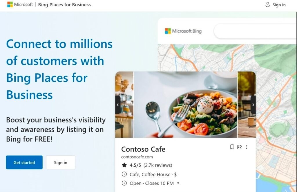 Bing Places for Business allows cafés to list menus, hours, photos, and contact information for free on Bing Search and Maps.