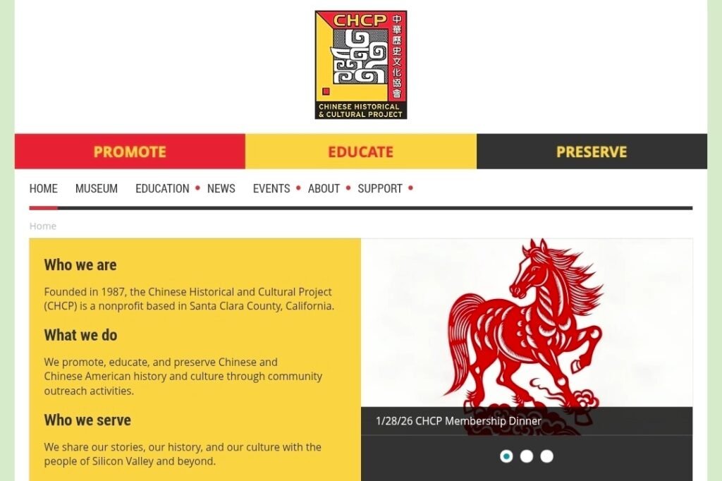 The Chinese Historical & Cultural Project (CHCP) in Silicon Valley focuses on Chinese American heritage and cultural preservation. Its event listings include community celebrations, historical exhibitions, educational programmes, and traditional gatherings.