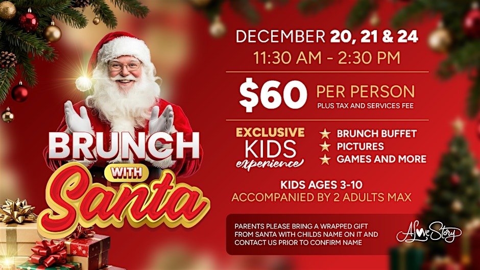 Description: Celebrate Christmas Eve with a festive brunch and a special visit from Santa Claus at A Love Story Winery & Bistro. Enjoy delicious food, holiday cheer, and a warm, family-friendly atmosphere where kids and adults can experience the magic of the season together. Guests are required to bring a wrapped gift with the recipient’s name for Santa. This 3-hour in-person event is perfect for creating joyful holiday memories with loved ones.