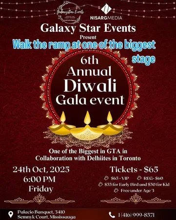 Step into the magic of Diwali at the 6th Annual Diwali Gala 2025 in Mississauga, one of the GTA’s most anticipated Festival of Lights celebrations. Hosted by Galaxystar Events, the evening promises a glamorous mix of culture, food, and entertainment. Guests will be treated to a lavish Indian buffet, dazzling fashion show, and high-energy live performances, all in a beautifully decorated festive setting that captures the true spirit of Diwali.