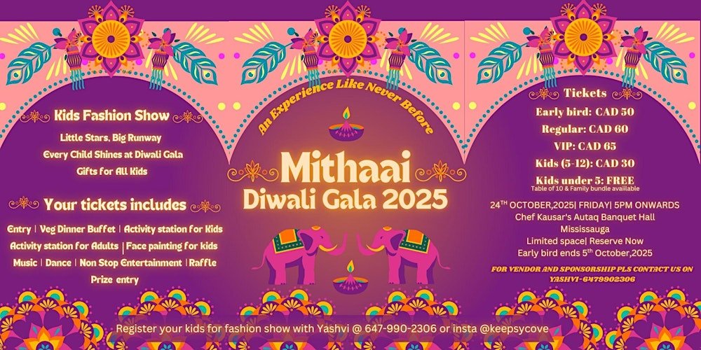 Celebrate Diwali in a truly spectacular way at the first-ever Mithaaí Diwali Gala in Mississauga. This vibrant evening combines tradition, culture, and fun in a family-friendly setting. Guests will enjoy a lavish dinner gala, music, live entertainment, games, and hands-on activities for both kids and adults. With freebies, DIY keepsakes, and a kids’ fashion show, this Diwali gala promises a night filled with joy, laughter, and unforgettable memories.