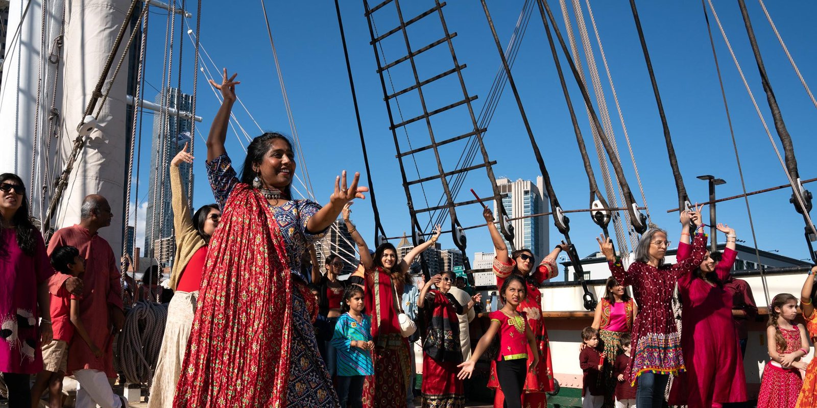 An intimate Raas-Garba celebration aboard the historic 1885 tall ship Wavertree, blending tradition with a uniquely scenic maritime setting.