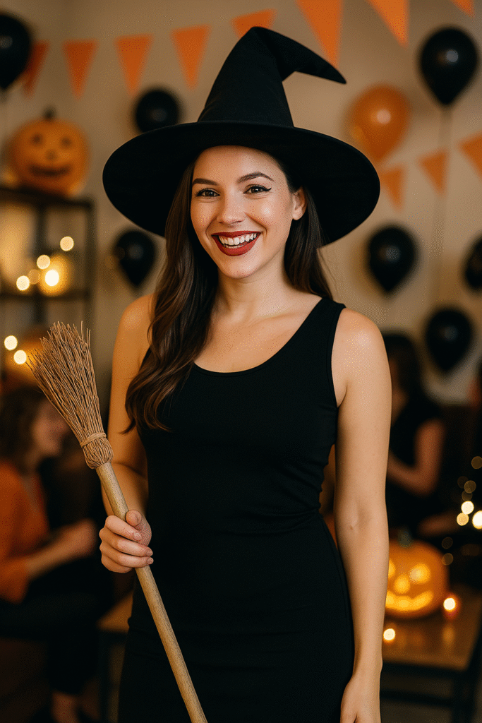 Witches are a classic for a reason. You probably already have most of what you need. A black dress, a pointy hat, maybe a broom if you are feeling extra, and you are basically done. Dark lipstick or smoky eyes can make it look extra cool but even without it, people know exactly who you are. Want to make it sparkly? Throw on a glittery wig or some fun shoes. It is simple but you can totally make it your own.