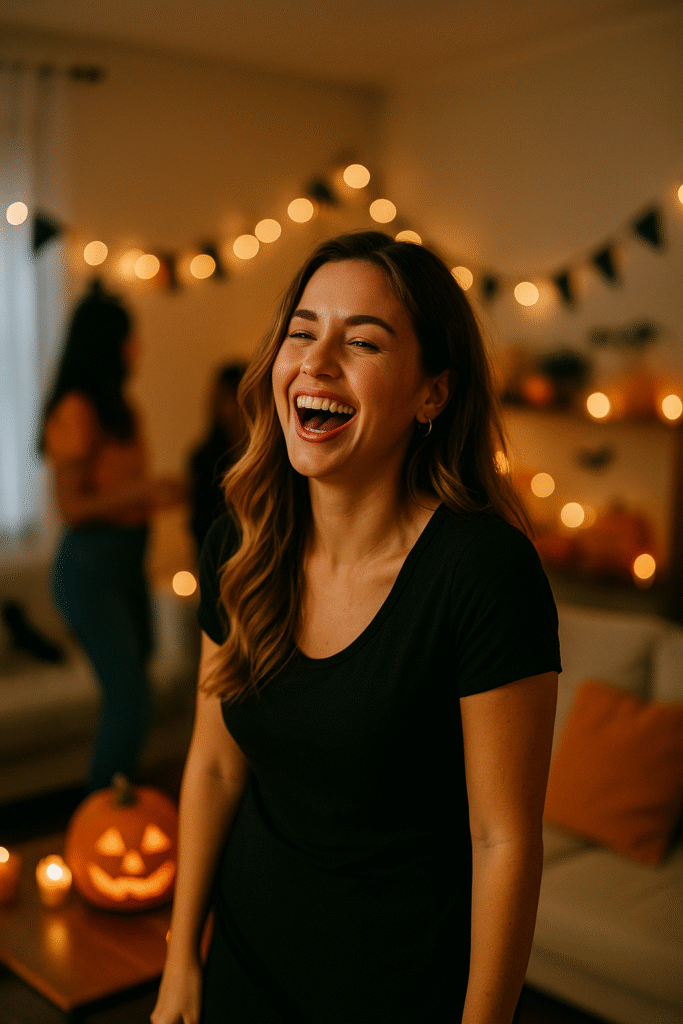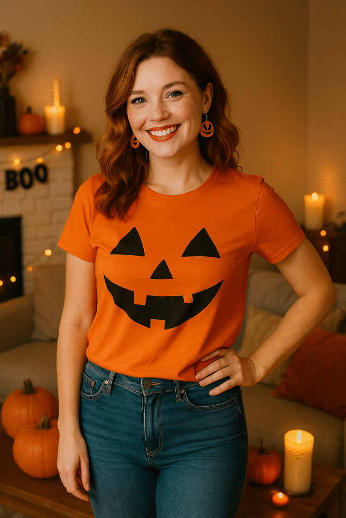 If you don’t want to think too hard, a Halloween-themed T-shirt works wonders. Skeletons, pumpkins, or tops that say Boo, paired with fun makeup or one statement piece and you are ready in minutes. Easy, cheap, and festive.