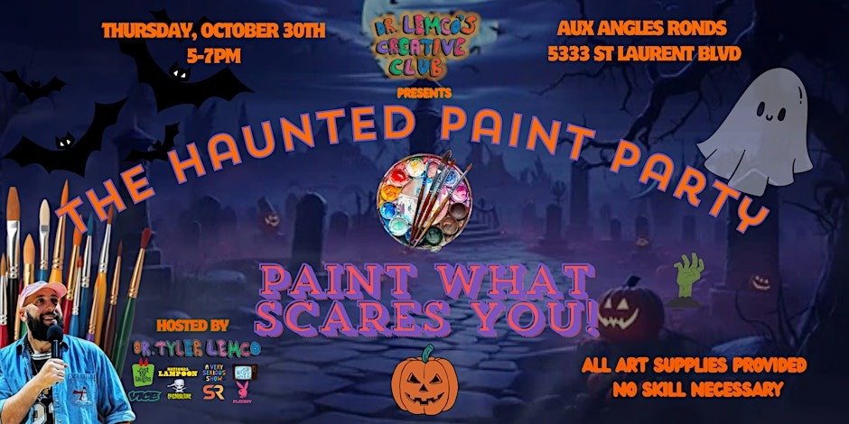 Description: Unleash your creativity at Dr. Lemco’s Haunted Paint Party. No experience needed—paint what scares you, enjoy spooky vibes, and take home your masterpiece. Perfect for solo adventurers or friends looking for a fun, creative Halloween activity.