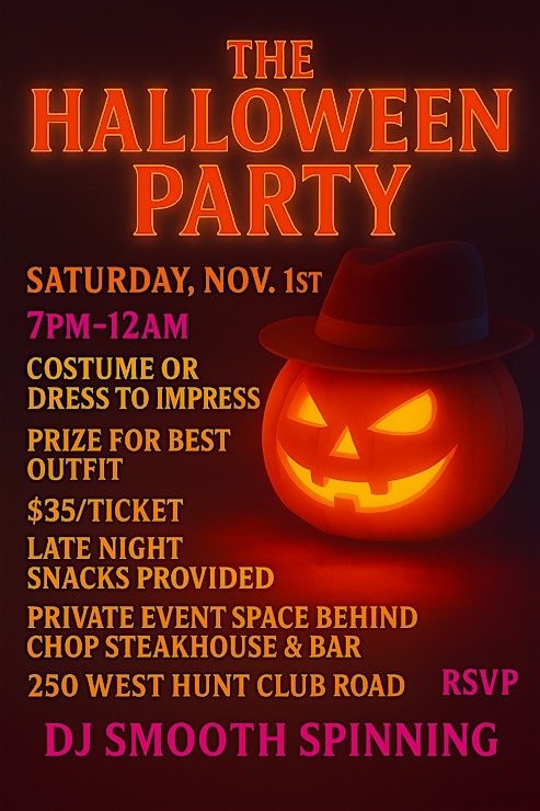 Description: Adults-only Halloween fun! Step into a private event space behind Chop Steakhouse & Bar for a night of spooky sophistication. Dress to impress or wear a costume, enjoy throwback music from DJ Smooth, delicious food, and affordable beverages. Compete for the best outfit prize and celebrate a grown-up, stylish Halloween without kids or trick-or-treat bags.