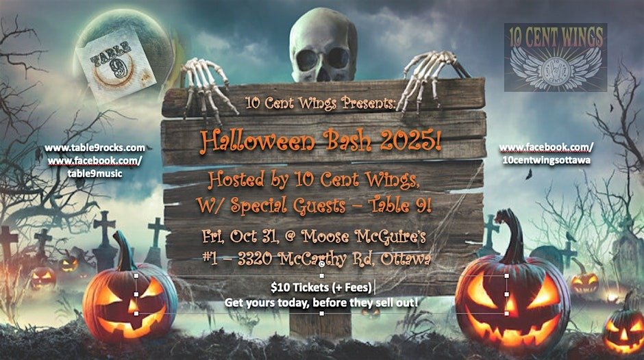 Description: Celebrate Halloween 2025 at Moose McGuire’s with a thrilling costume bash! Enjoy live music from 10 Cent Wings and Table 9, dance the night away, and showcase your most creative, spooky, or sexy costumes. Limited capacity—grab your tickets early for a night of chills, thrills, and festive fun with friends.