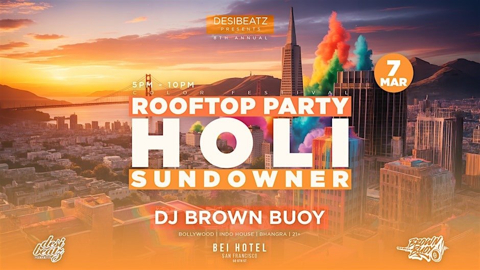 Description: Celebrate Holi with a vibrant rooftop sundowner party in the heart of San Francisco. Dance to high energy Bollywood and Desi beats by DJ Brown Buoy as the sun sets over the city skyline. Expect festive vibes, colourful moments and nonstop music in an open air setting. Gather your crew and get ready to paint the evening with rhythm, colour and celebration.