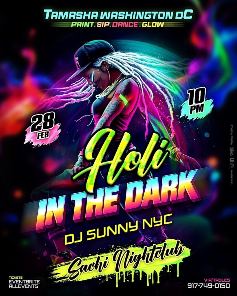 Description: Experience Holi after dark at Washington D.C.’s hottest nightclub. Dance under neon lights with DJ Sunny spinning Bollywood and party anthems, enjoy premium glow-in-the-dark paints, and get your face painted by professionals. Sip top-shelf cocktails, indulge in delicious food, and join a vibrant, high-energy crowd for a bold and unforgettable celebration. Dress in white or neon and get ready to glow from head to toe on this electric Holi night.