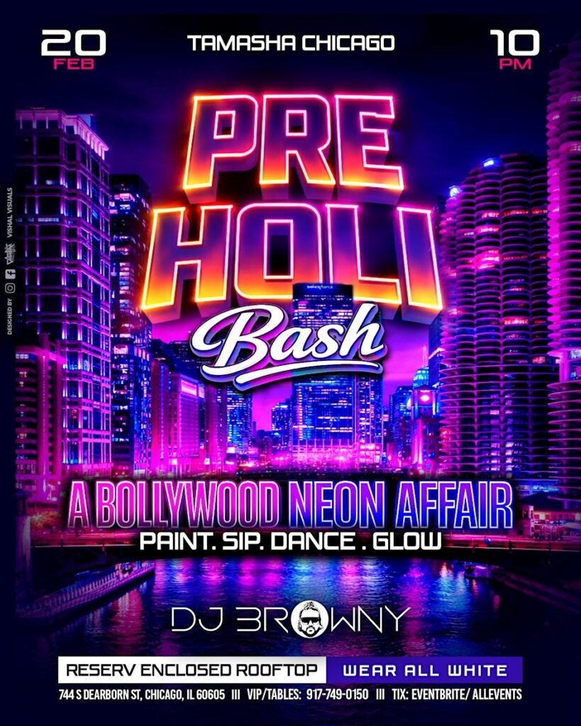 Description: Step into a neon drenched Pre Holi Bash where nightclub energy meets vibrant colour. Dance all night to Bollywood beats by DJ Browny while glowing paints and face art light up the rooftop. Expect premium party vibes, high energy music and an electric crowd dressed in white and neon. This late night Holi celebration promises bold colours, nonstop dancing and an unforgettable Chicago experience.