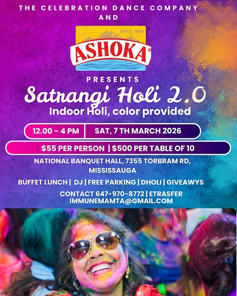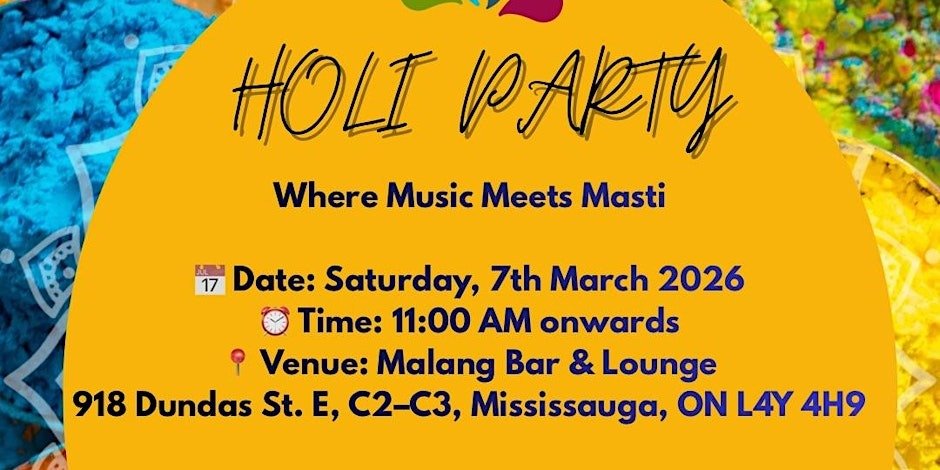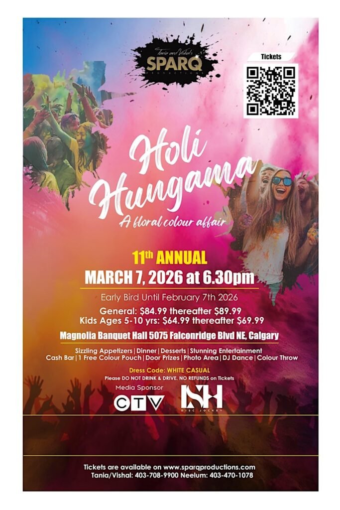 Description: Calgary’s only indoor Holi colour throw! Experience the 11th Annual Holi Hungama with a 3-course Indian dinner, live DJ, dance performances, and an exclusive floral-themed fashion show. Every ticket comes with a free pouch of dry colour for the iconic Holi throw. Family and community-friendly, this event blends culture, music, food, and festive fun for an unforgettable night. Dry colours only; no outside colour or water toys allowed.