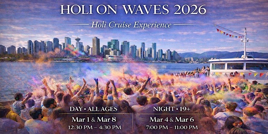 Description: Celebrate Holi on the water with a high-energy festival cruise featuring live DJs, vibrant rooftop colors, and nonstop dancing. Enjoy stunning skyline views of False Creek and English Bay, fully licensed bars, and a curated crowd for a premium nightlife experience. Dress in bright, festive attire and immerse yourself in Vancouver’s most unforgettable Holi celebration.