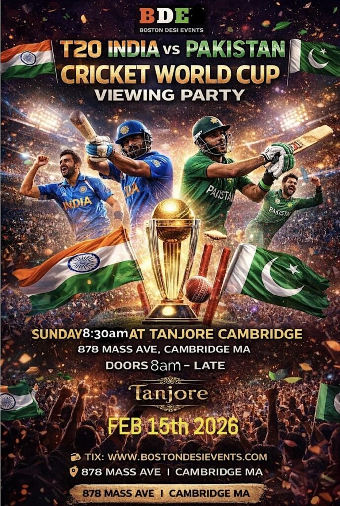 Description: Experience the excitement of India vs. Pakistan T20 match live on huge screens! Feel the stadium atmosphere with passionate fans all around. Enjoy live commentary, authentic Indian food and drinks, and the electric energy of Boston’s Desi community. Cheer for your team and soak in every thrilling moment. Perfect for cricket lovers looking for a fun and lively watch party.