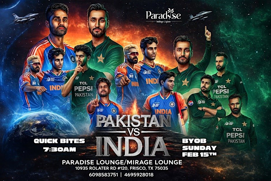 Description: Watch the epic India vs. Pakistan T20 match live on big screens at Paradise Hookah Lounge! Enjoy stadium-like energy with cheering fans, live reactions, and a fun community vibe. Grab quick bites, sip your favourite drinks, and experience premium hookah in a lively setting. BYOB friendly, perfect for friends, families, and cricket enthusiasts. Cheer, celebrate, and soak in every intense moment of this legendary rivalry.