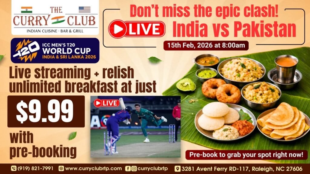 Description: Experience the epic India vs. Pakistan T20 World Cup rivalry live in Raleigh! Join fellow fans at The Curry Club, cheer for your team, and enjoy stadium-like energy right in the city. Indulge in an unlimited Indian breakfast while watching the match on big screens. Bring your friends, wear your team colors, and immerse yourself in the thrilling cricket atmosphere. A perfect morning for cricket lovers and food enthusiasts alike.