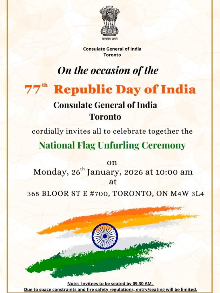 Description: Join the Consulate General of India, Toronto in celebrating the 77th Republic Day of India with the official National Flag Unfurling Ceremony. This solemn and patriotic gathering invites members of the Indian diaspora and friends of India to come together in the spirit of unity and national pride.