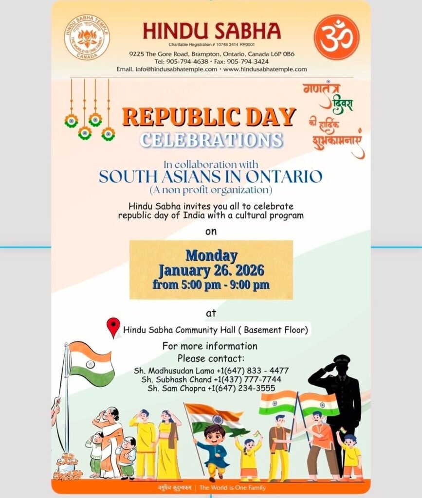 Description: Hindu Sabha, in collaboration with South Asians in Ontario, invites the community to celebrate the Republic Day of India with a vibrant cultural programme. The evening will feature performances highlighting India’s rich heritage, unity in diversity, and patriotic spirit. Families and community members are welcome to come together and mark this significant national occasion in a festive and inclusive atmosphere.