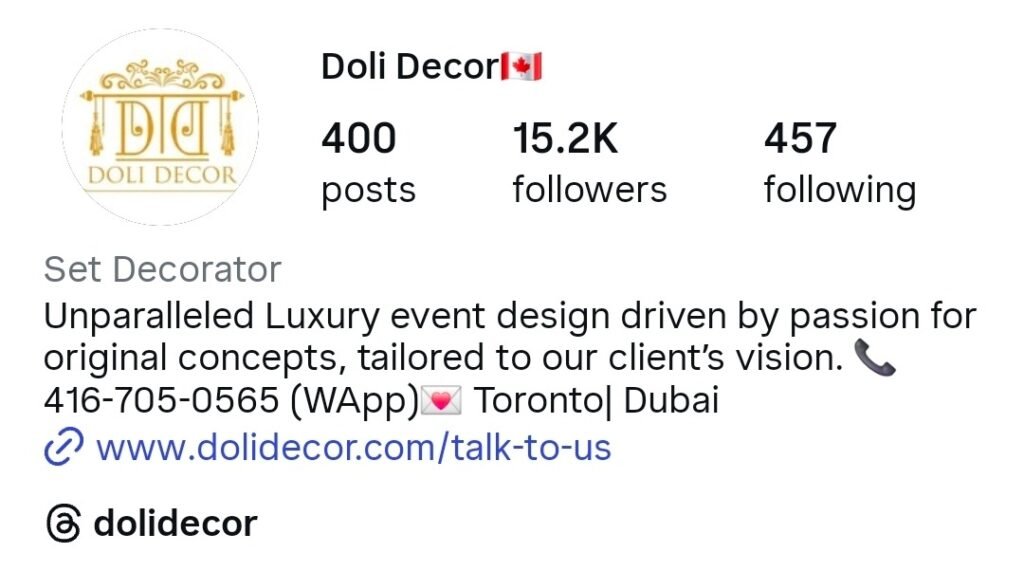 Doli Decor provides planning and styling services for South Asian wedding events. Their work focuses on creative event design for ceremonies such as Mehndi, Nikkah, and Walima celebrations.