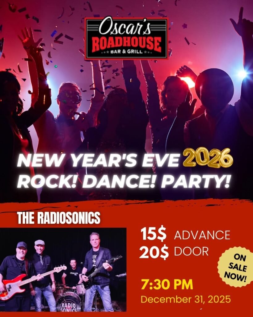 Description: Ring in 2026 at Oscar’s Roadhouse with live music by The Radiosonics, dancing, and a high-energy party atmosphere. Enjoy free champagne at midnight, party favors, and a night full of fun with friends. Don’t miss Brampton’s ultimate New Year’s Eve celebration.