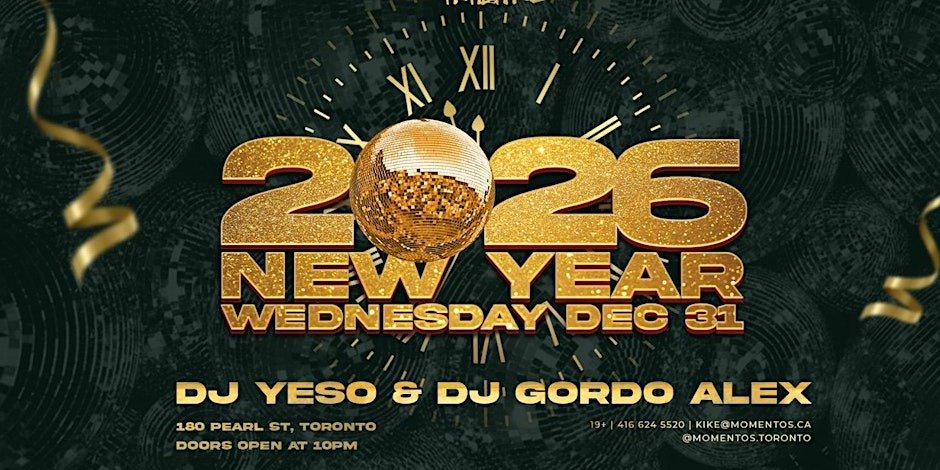 Description: Welcome 2026 with a high-energy New Year’s Eve celebration at Momentos Toronto. Dance the night away with DJ Gordo Ex and DJ Yeso spinning vibrant party and Latin beats. The night promises great music, lively vibes, and special performances in the heart of downtown Toronto. Gather your friends and ring in the New Year with an unforgettable countdown and non-stop celebration.