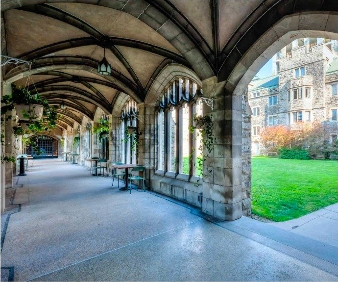 It features arched corridors, stone walls, and a European-inspired academic atmosphere. The location is highly controlled, with only one booking allowed per time slot.
