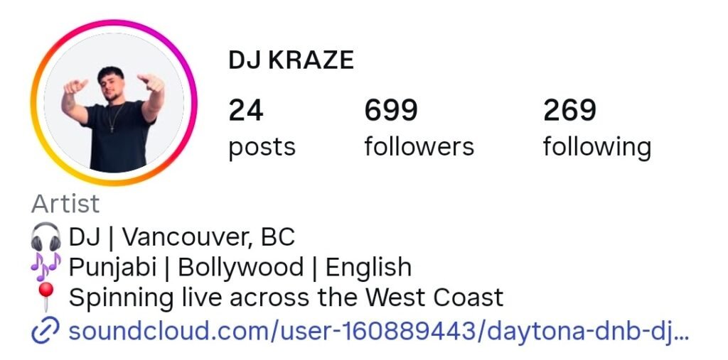 DJ Kraze is a Lower Mainland DJ active on social media and known for lively DJ sets that mix Bollywood, Punjabi, and Western tracks.