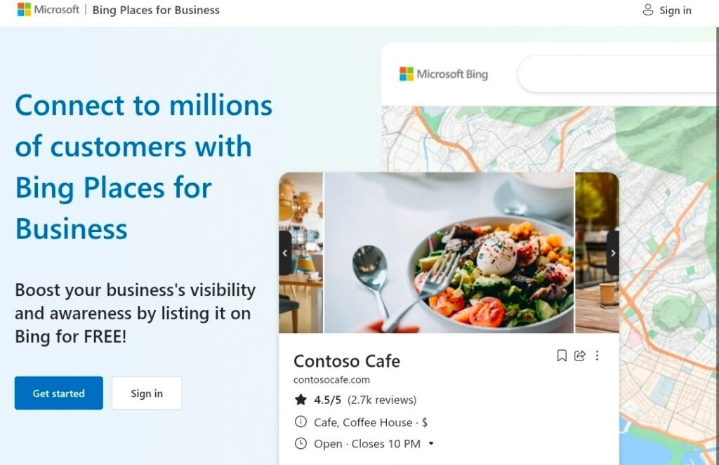 Bing Places for Business allows street food vendors to create free listings on Bing Search and Maps. Listings include photos, menus, hours, and contact information.