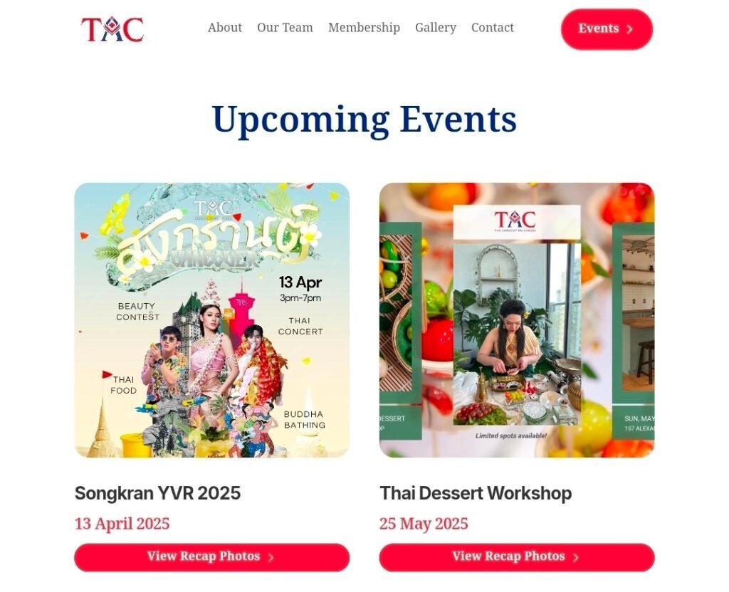 Its event calendar includes celebrations like Songkran YVR (Thai New Year), Thai dessert workshops, outdoor meetups, networking events, and cultural performances that bring people together to celebrate Thai tradition and heritage across Canadian provinces.
